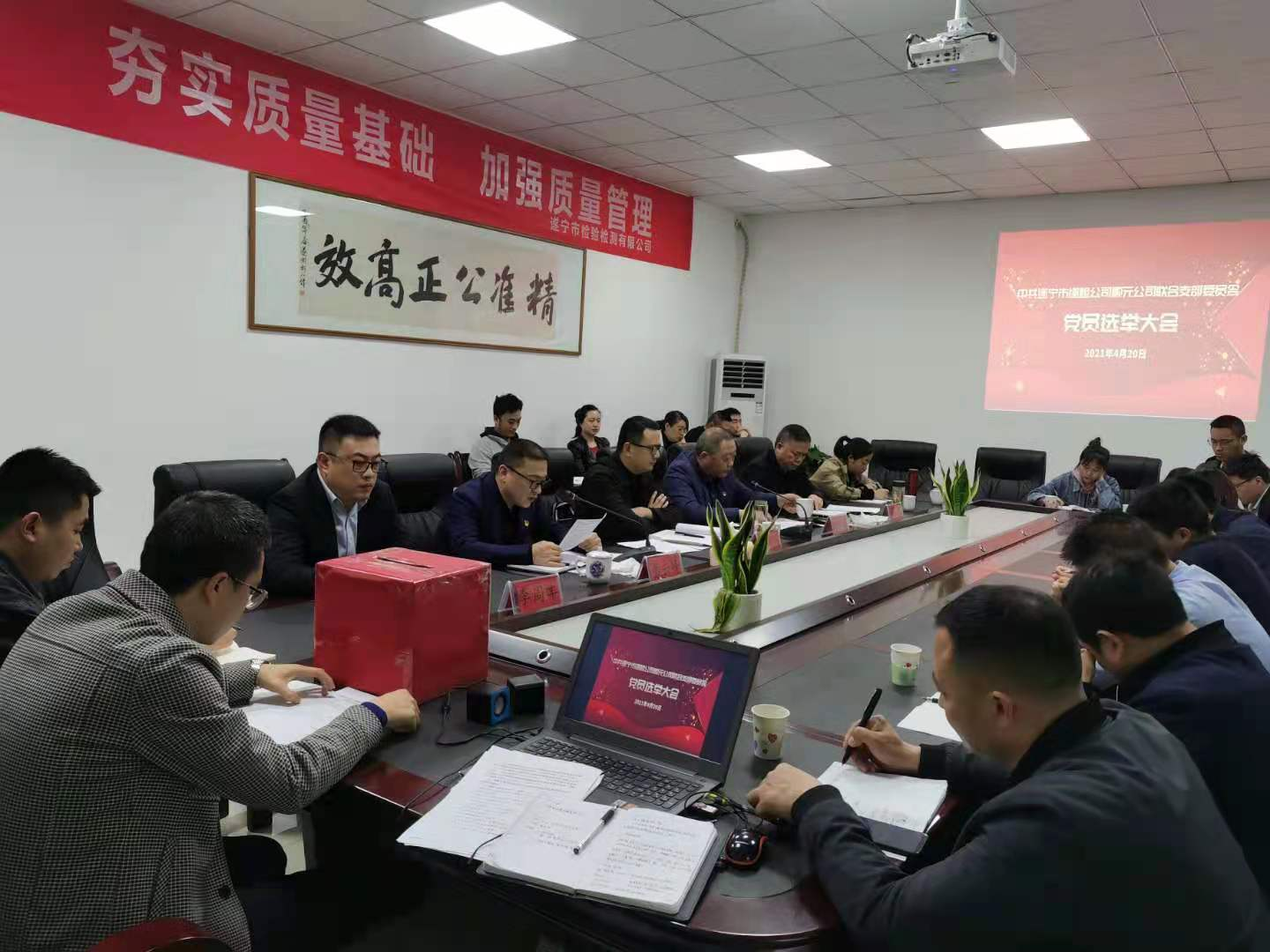 ? ? 大會在莊嚴(yán)的國歌聲中拉開了序幕。會上,賈杰洪同志匯報(bào)了成立遂檢公司順元公司聯(lián)合支部支委籌備工作情況,馮凱同志宣讀了興業(yè)集團(tuán)黨委的批復(fù)文件,戴云峰同志組織學(xué)習(xí)了《關(guān)于嚴(yán)肅換屆紀(jì)律加強(qiáng)換屆風(fēng)氣監(jiān)督的通知》。隨后,以舉手表決的方式,大會通過了《選舉辦法》、推選了監(jiān)票、計(jì)票工作人員。經(jīng)黨員無記名、差額投票,賈杰洪、馮凱、戴云峰、薛娟四名同志當(dāng)選為遂檢公司順元公司聯(lián)合支部第一屆委員會委員。在隨即召開的第一屆支部委員會第一次支委會上,賈杰洪同志被選舉為支部書記,馮凱同志被選舉為支部副書記。